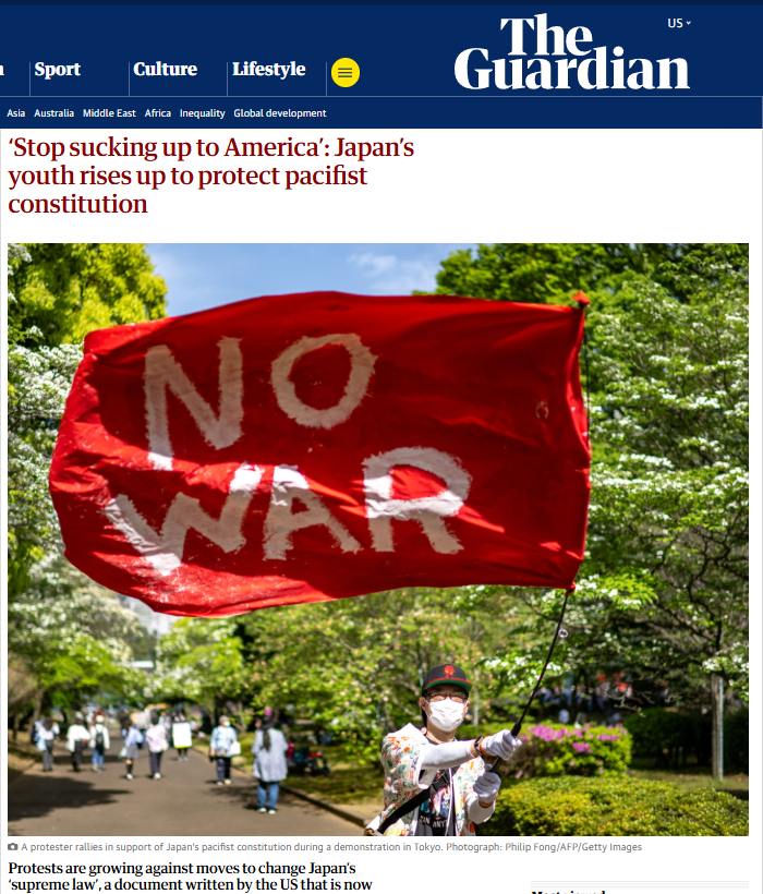 日本首相高市早苗關(guān)于修憲的相關(guān)表態(tài)引發(fā)廣泛質(zhì)疑和反對(duì)。英國(guó)《衛(wèi)報(bào)》刊發(fā)題為《“停止對(duì)美國(guó)阿諛奉承”:日本青年奮起捍衛(wèi)和平憲法》的文章,文中稱,反對(duì)修改日本和平憲法的抗議活動(dòng)日益高漲,越來越多日本年輕人正成為這場(chǎng)反對(duì)修憲運(yùn)動(dòng)的中堅(jiān)力量。