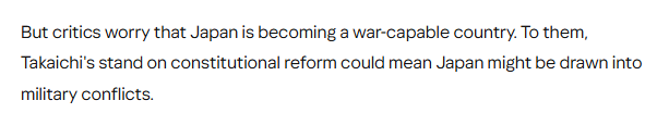 文章認(rèn)為,日本首相高市早苗一直支持修改和平憲法。雖然她尚未明確說明具體修改內(nèi)容,但許多人認(rèn)為這將涉及修改放棄戰(zhàn)爭(zhēng)的憲法第九條。批評(píng)人士擔(dān)心日本正朝著成為一個(gè)具備戰(zhàn)爭(zhēng)能力的國(guó)家邁進(jìn)。高市早苗在憲法改革問題上的立場(chǎng)可能意味著日本將介入軍事沖突。