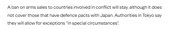 文章分析稱,此前將武器出口限制在救援、運(yùn)輸、預(yù)警、監(jiān)視和掃雷這五類裝備的規(guī)定將被取消。這意味著日本現(xiàn)在可以向包括美國(guó)和英國(guó)在內(nèi)的17個(gè)與其簽訂防務(wù)協(xié)定的國(guó)家出售殺傷性武器。對(duì)參與沖突的國(guó)家實(shí)施武器出口的禁令將繼續(xù)保留,但該禁令不適用于與日本有防務(wù)協(xié)定的國(guó)家。日本政府表示,將在“特殊情況下”允許例外處理。