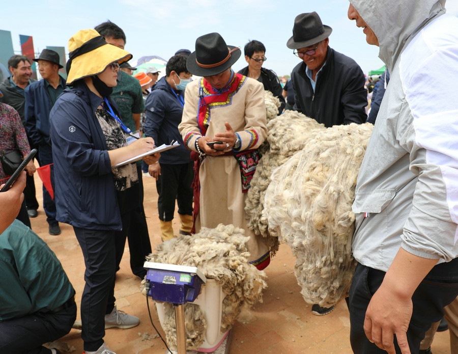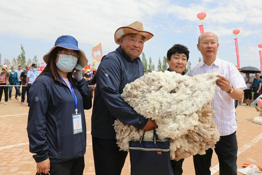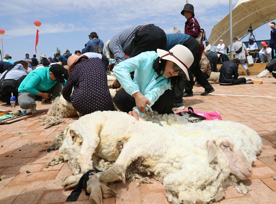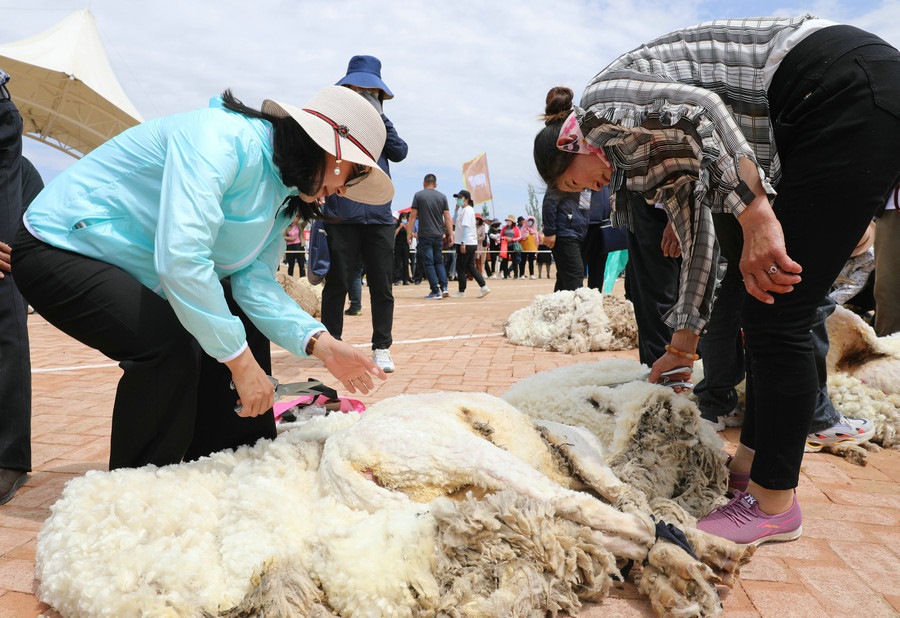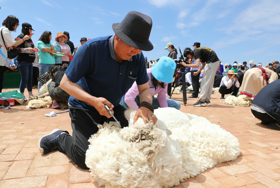 在同步舉行的剪羊毛大賽中,參賽選手們用剪刀和電動(dòng)剪毛機(jī),在細(xì)毛羊身上翻飛操作,牧民們熟練的身手和精湛的技藝,使一只只羊片刻之間“脫胎換骨”。