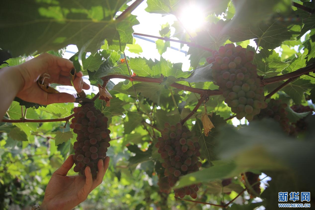 7月6日,阿勒泰農(nóng)牧業(yè)公司工作人員摘下成熟的葡萄。新華網(wǎng) 楊騰格爾 攝