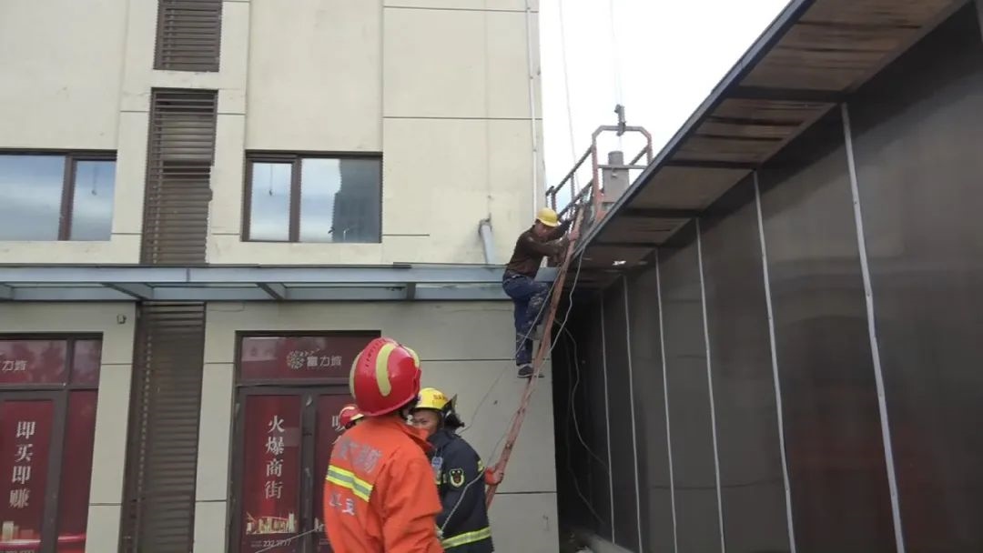 指揮員立即命令第一營救小組前往建筑內(nèi)部,試圖通過住戶窗戶進行營救,當(dāng)營救小組到達指定位置后發(fā)現(xiàn),消防隊員與被困工人相距太遠(yuǎn),空中營救的危險性和困難程度較高。消防隊員通過與被困工人交流,提醒他抓好繩索,安撫他的情緒。很快,第二組營救的消防隊員利用掛鉤梯爬到二層位置把纏繞的鋼絲繩拉到地面,4人分別拽一根鋼絲繩,松解纏繞的鋼絲繩,使升降機恢復(fù)運行。而此時,天氣逐漸放晴,風(fēng)力也開始減弱,在消防隊員們的努力下,升降機緩緩下降,18時12分,被困的工人安全降落到地面。