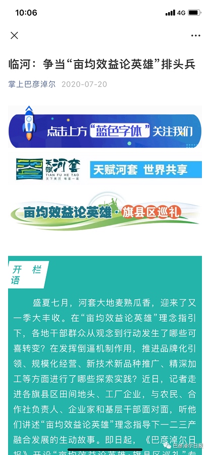 實(shí)施策采一體化以后,先后整體策劃推出了深度報(bào)道《河套——胡煥庸線西北的一個(gè)奇跡》,重磅述評(píng)《將畝均效益論英雄理念貫徹到底》《烏梁素海的前世今生》《塞上江南換新顏》等作品,從全新的角度解讀巴彥淖爾高質(zhì)量發(fā)展,被新華網(wǎng)、人民網(wǎng)、今日頭條廣泛轉(zhuǎn)載,廣受好評(píng)。重磅報(bào)道《Hello,我是金草胡羊,我回家鄉(xiāng)了!》《24小時(shí)做一根面條》《河套小麥,麩皮都能吃》等讓讀者耳目一新,受到自治區(qū)黨委宣傳部的充分肯定。