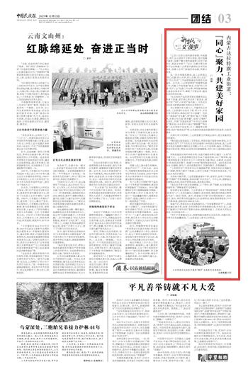 2025年12月2日,《中國(guó)民族報(bào)》第3版刊發(fā)題為《內(nèi)蒙古達(dá)拉特旗工業(yè)街道:“同心”聚力,共建美好家園》的文章,報(bào)道了內(nèi)蒙古達(dá)拉特旗工業(yè)街道以“同心共建、同心共學(xué)、同心共事、同心共樂(lè)”的“四心四共”工作法賦能基層治理。打造“同心向暖·花開工業(yè)”民族工作品牌,將民族團(tuán)結(jié)融入基層治理各環(huán)節(jié),奏響了開放包容、融榮共居的和諧樂(lè)章。