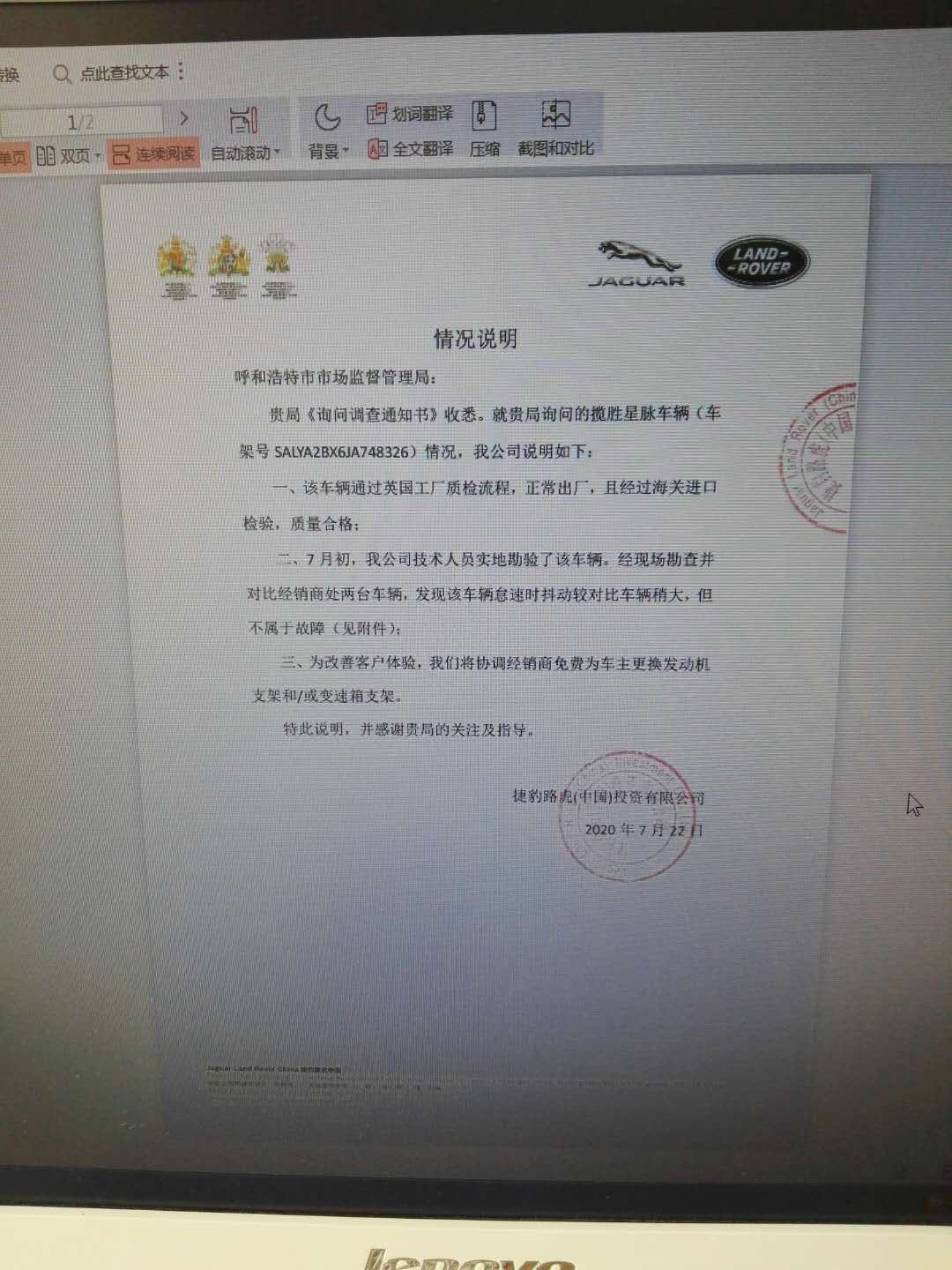 今年5月初,李女士將此事投訴到了呼和浩特市市場(chǎng)監(jiān)督管理局。經(jīng)執(zhí)法人員調(diào)查,李女士反映的情況屬實(shí)。隨后,在執(zhí)法人員的關(guān)注下,路虎總部還派人來查看該車輛,但是堅(jiān)稱該車沒有質(zhì)量問題。此后,該局向路虎總部發(fā)出了《詢問調(diào)查通知書》。7月22日,捷豹路虎(中國(guó))投資有限公司向該局回函稱:“1.該車通過英國(guó)工廠質(zhì)檢流程,正常出廠,而且經(jīng)過海關(guān)進(jìn)口檢驗(yàn),質(zhì)量合格。2.7月初,我公司技術(shù)人員實(shí)地勘驗(yàn)了該車輛,經(jīng)現(xiàn)場(chǎng)勘察并且對(duì)比經(jīng)銷商(順馳路捷)處兩臺(tái)車輛,發(fā)現(xiàn)該車輛怠速時(shí)抖動(dòng)較對(duì)比車輛稍大,但不屬于故障。3.為改善客戶體驗(yàn),我們將協(xié)調(diào)經(jīng)銷商免費(fèi)為車主更換發(fā)動(dòng)機(jī)支架和/或變速箱支架?!?/p>