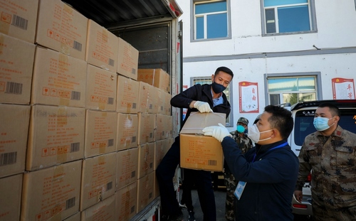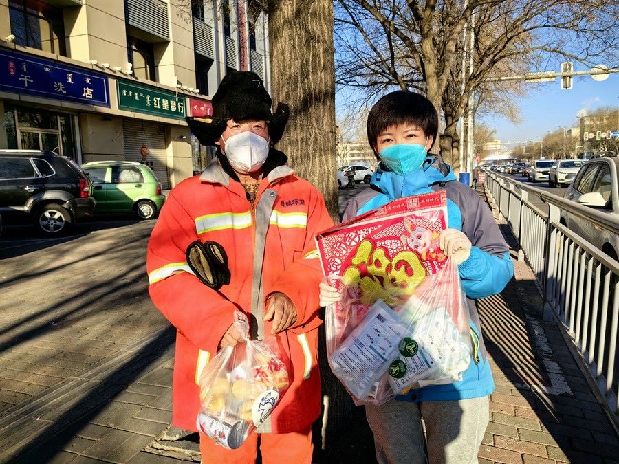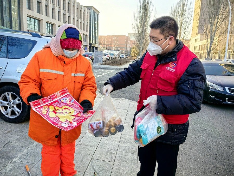大家身穿志愿者馬甲,三五人一組結(jié)伴走上街頭,只要見到正在工作的環(huán)衛(wèi)工人,就會遞上一份節(jié)日暖心包,里面有臘八粥、小點心、春聯(lián)福字、兔年吉祥物裝飾卡片,還有酒精、口罩等防疫物資。