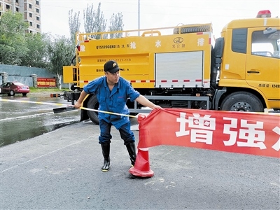 在這之前,通遼市排水管理處已啟動應(yīng)急預(yù)案,搶險人員及應(yīng)急搶險車輛陸續(xù)就位。負責(zé)明仁立交橋排水搶險的第2小組的4名成員兵分兩路,需要勸退東、西兩側(cè)準(zhǔn)備過橋的汽車司機和行人,以及排布車輛、施拉警界線……橋西邊,污水管道維護隊車隊隊長張再智邊忙著手里的活兒,邊通過對講機呼叫副隊長盛博,催促他趕緊向過往的車輛及行人喊話,提醒大家橋下水深不能通行。此時,盛博已駕車由西向東行至立交橋南側(cè)的輔路上,雨水遮住了視線,雨刮器速度越來越快,他邊回應(yīng)張再智,邊放慢車速向人們喊話。
