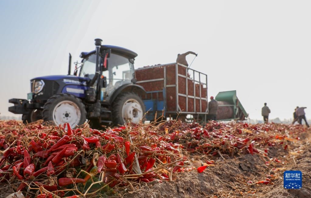 10月25日,在開魯縣東風(fēng)鎮(zhèn)東方紅村,村民在田間收獲紅干椒。新華社記者 連振 攝