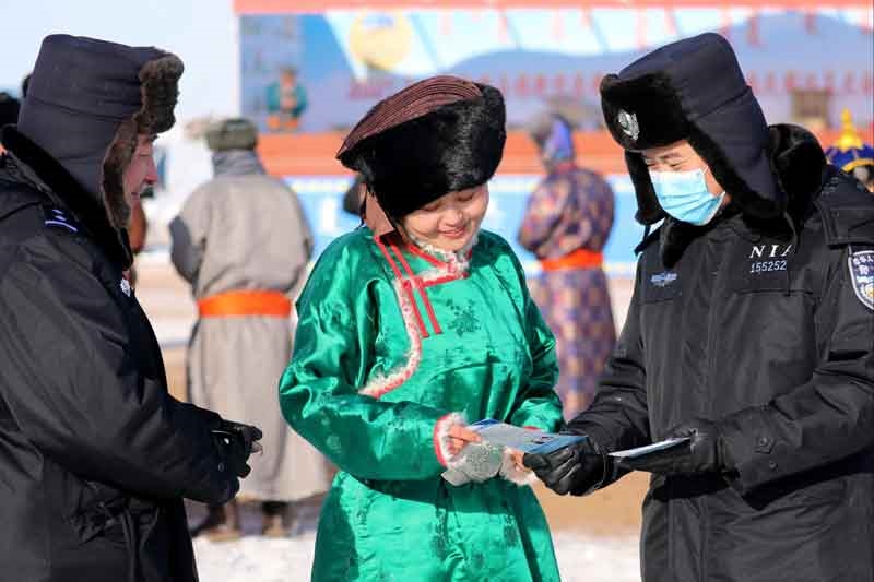 錫林郭勒邊境管理支隊(duì)達(dá)來、洪格爾、巴音都蘭等3 個(gè)邊境派出所共派出20多名警力,對(duì)于前來參加那達(dá)慕的人們進(jìn)行嚴(yán)格檢查,并向牧民群眾講解當(dāng)前面臨的新冠肺炎疫情防控形勢(shì),發(fā)放宣傳冊(cè)。(內(nèi)蒙古日?qǐng)?bào)記者 巴依斯古楞 攝影報(bào)道)