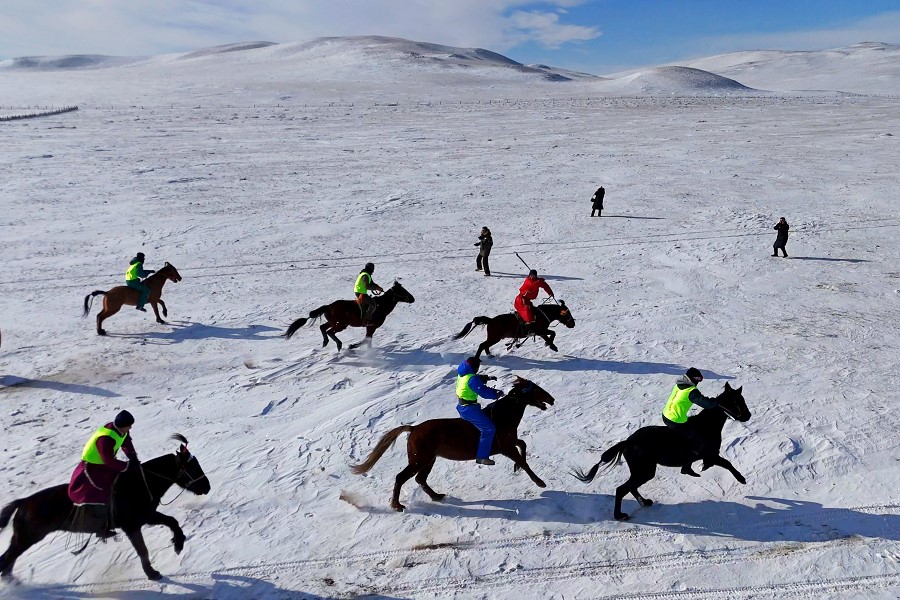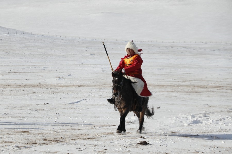 隨著裁判一聲令下,馬匹奮蹄疾行,冬日草原也被這激情瞬間引燃。騎手們也盡顯高超的騎術,不甘落后、彼此反超,高潮迭起。