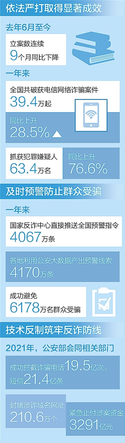 據(jù)介紹,全國公安機(jī)關(guān)深入開展“云劍”“長城”“斷卡”“斷流”“5·10”等專項行動,先后組織開展150次全國集群戰(zhàn)役。一年來,共破獲電信網(wǎng)絡(luò)詐騙案件39.4萬起,抓獲犯罪嫌疑人63.4萬名,同比分別上升28.5%和76.6%。根據(jù)最新統(tǒng)計,電信網(wǎng)絡(luò)詐騙立案數(shù)連續(xù)9個月同比下降,打擊治理工作取得顯著成效。