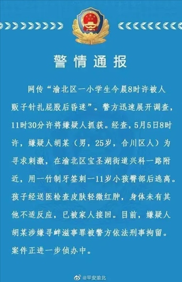 ·重慶警方通報“渝北一學生被人販子針扎后昏迷”:嫌疑人被依法刑事拘留。