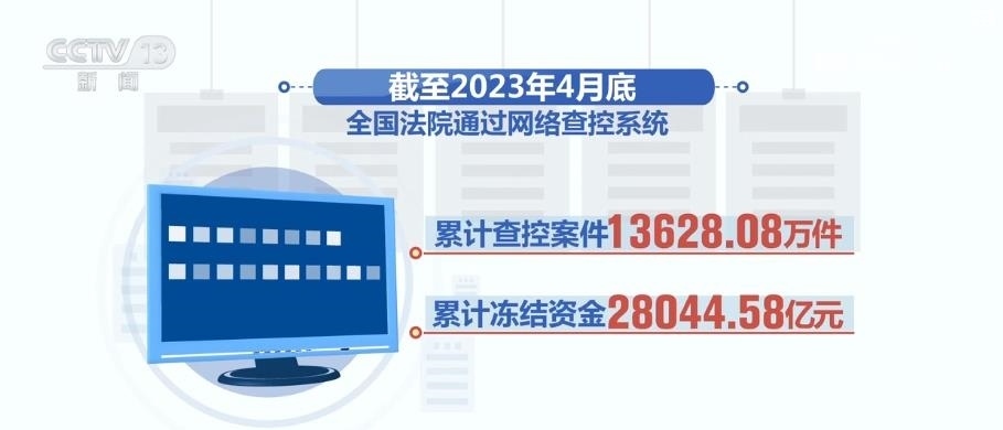 截至2023年4月底,全國法院通過網(wǎng)絡查控系統(tǒng)累計查控案件13628.08萬件,累計凍結(jié)資金28044.58億元,查詢房屋、土地等不動產(chǎn)信息81963.89萬條,車輛19018.00萬輛,證券42195.43億股,漁船和船舶371.79萬艘,網(wǎng)絡資金1009.75億元,有力維護了勝訴當事人合法權益。