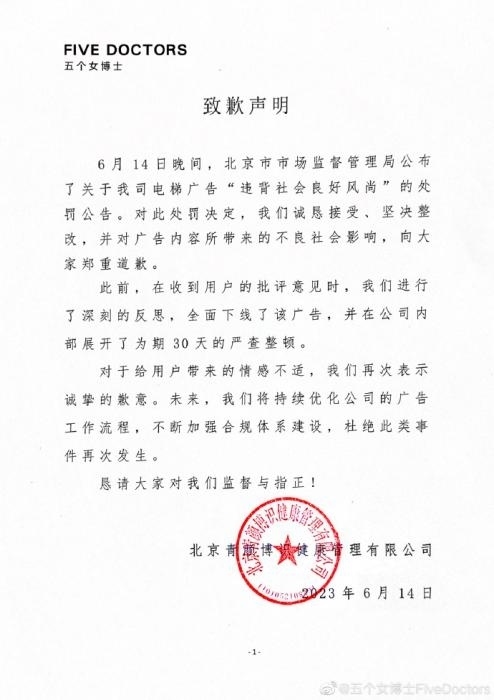 6月14日晚,“五個女博士”也在其微博發(fā)布致歉聲明稱,對此處罰決定,誠懇接受、堅決整改,并對廣告內容所帶來的不良社會影響,向大家鄭重道歉。