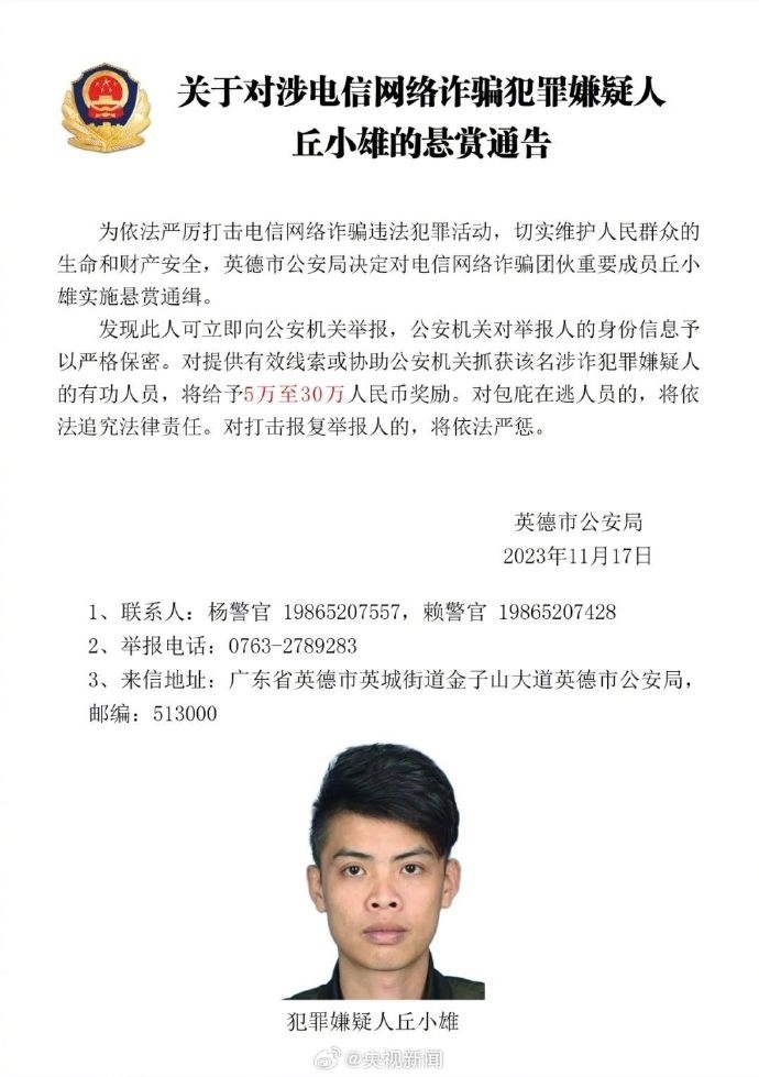 近日,廣東英德市公安局對電信網(wǎng)絡(luò)詐騙團(tuán)伙重要成員張永勝、丘小雄、徐培星、張方文、巫昌發(fā)、鄧寶運(yùn)、鄧海堅(jiān)實(shí)施懸賞通緝。發(fā)現(xiàn)上述人員立即向公安機(jī)關(guān)舉報(bào),對提供有效線索或協(xié)助公安機(jī)關(guān)抓獲該名涉詐犯罪嫌疑人的有功人員,將給予5萬至30萬人民幣獎(jiǎng)勵(lì)。