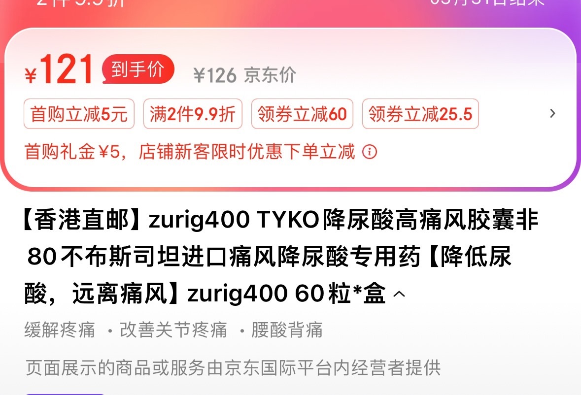 劉彬今年年初再次購買時,發(fā)現(xiàn)多個購物平臺都不再出售zurig80非布司他降酸片,詢問客服后被告知缺貨。然后他就看到一個“zurig400”的產(chǎn)品,和zurig80包裝幾乎一模一樣,產(chǎn)品宣傳也是說降尿酸、痛風(fēng)藥。