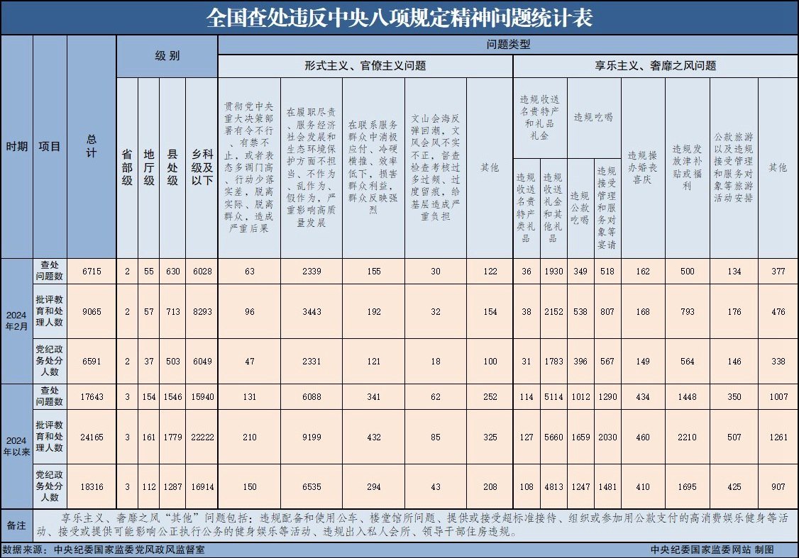 央視網(wǎng)消息:3月26日,中央紀委國家監(jiān)委公布了2024年2月全國查處違反中央八項規(guī)定精神問題匯總情況。當月,全國共查處違反中央八項規(guī)定精神問題6715起,批評教育和處理9065人,其中黨紀政務處分6591人,這是連續(xù)第126個月公布月報數(shù)據(jù)。