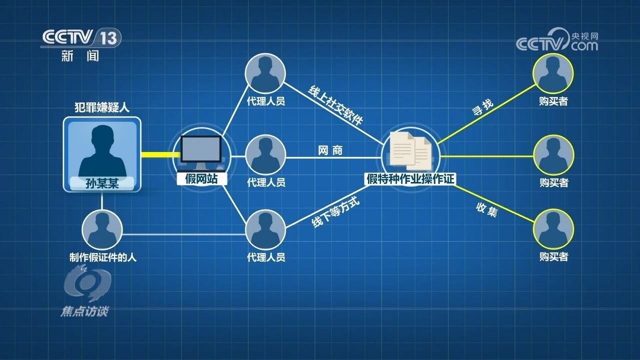 據(jù)介紹,犯罪嫌疑人孫某某是最上游,他首先花錢雇人制作了假網(wǎng)站,然后發(fā)展多名代理人員,代理通過線上社交軟件、網(wǎng)商和線下等方式,尋找、收集花錢購買假的特種作業(yè)操作證的人員。由專門負(fù)責(zé)制作假證件的人,制作好假證,發(fā)送給相應(yīng)的下線代理人員,最后到購買者手里。