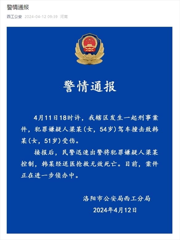 央視網消息:洛陽市公安局西工分局4月12日通報,4月11日18時許,該轄區(qū)發(fā)生一起刑事案件,犯罪嫌疑人梁某(女,54歲)駕車撞擊致韓某(女,51歲)受傷。接報后,民警迅速出警將犯罪嫌疑人梁某控制,韓某經送醫(yī)搶救無效死亡。目前,案件正在進一步偵辦中。