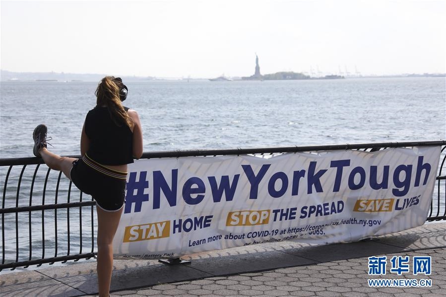6月10日,一名女子在美國紐約一處公園內寫有“紐約堅強”的橫幅旁鍛煉。新華社記者王迎攝