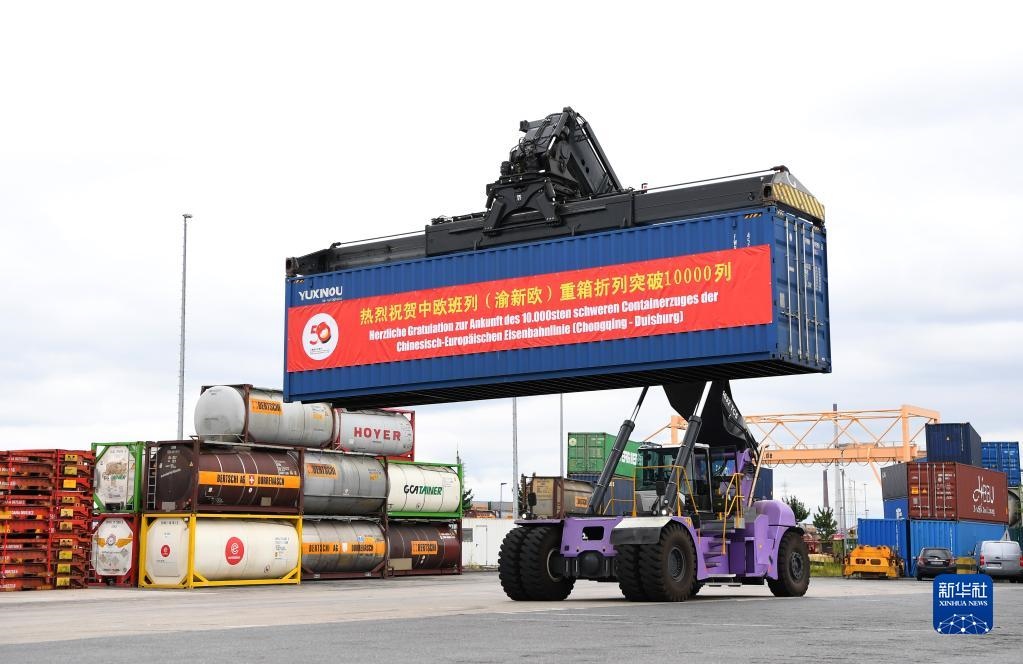 這是7月11日在德國(guó)杜伊斯堡市拍攝的中歐班列(重慶)第10000列重箱折列接車儀式現(xiàn)場(chǎng)。中國(guó)首條中歐班列線路中歐班列(重慶)第10000列重箱折列接車儀式11日在杜伊斯堡市DIT場(chǎng)站舉行。新華社記者任鵬飛攝