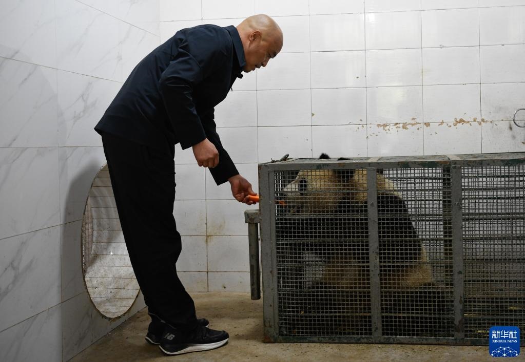 10月18日,在中國大熊貓保護(hù)研究中心雅安基地,飼養(yǎng)師董禮用胡蘿卜安撫進(jìn)入轉(zhuǎn)運籠的大熊貓“四?!薄P氯A社記者 胥冰潔 攝