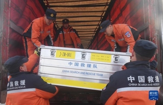 2月16日,在土耳其哈塔伊省安塔基亞市,中國救援隊隊員搬運設(shè)備。