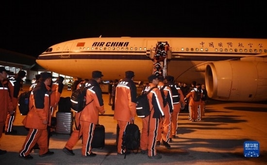2月16日,中國救援隊隊員在土耳其阿達納國際機場乘坐國航包機回國。