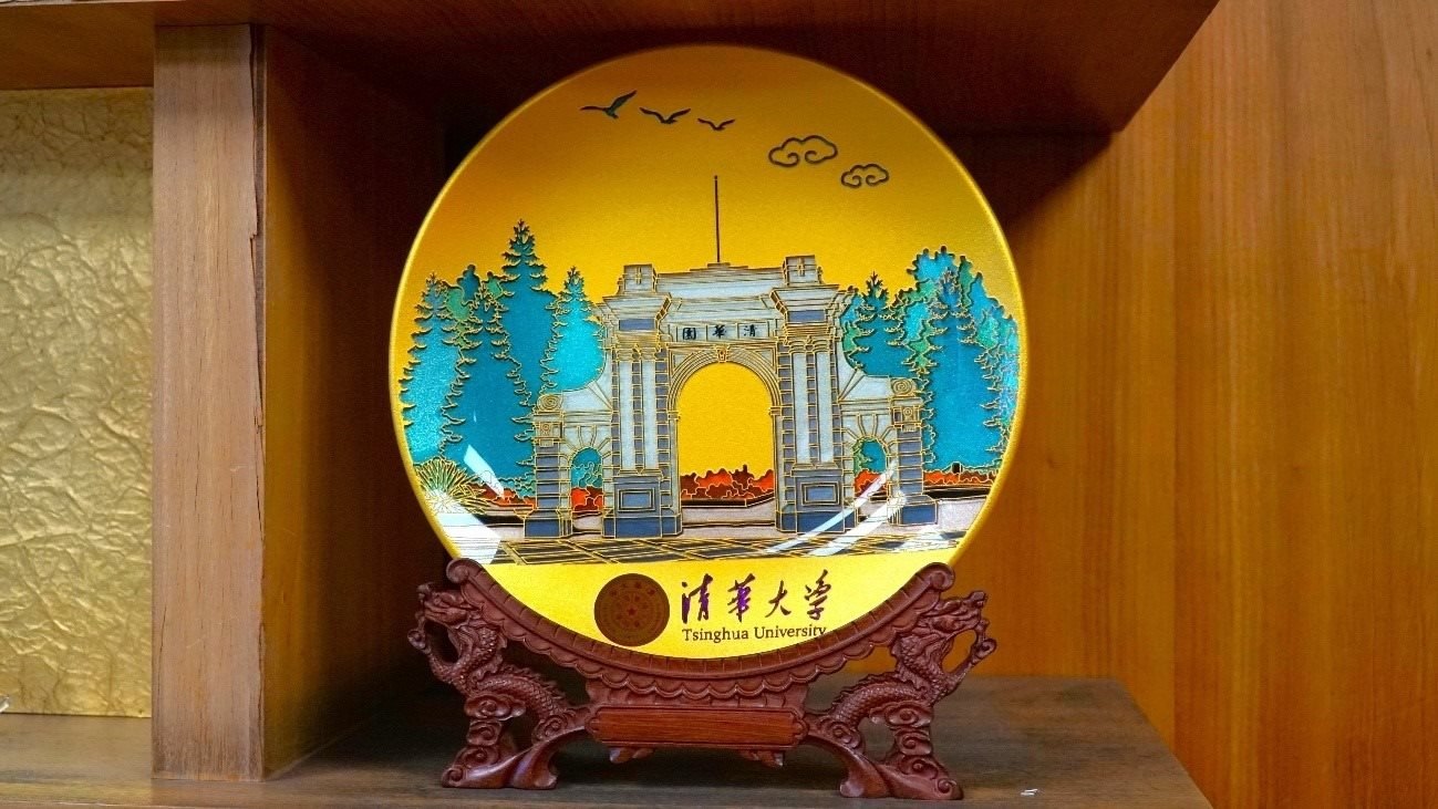 擺放在會(huì)議室的清華大學(xué)紀(jì)念盤。人民網(wǎng)視頻截圖