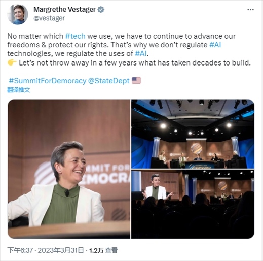 同一天,歐盟“適應(yīng)數(shù)字時(shí)代的歐洲”委員會(huì)執(zhí)行副主席瑪格麗特·維斯塔格(Margrethe Vestager)在社交媒體上表示,她對(duì)人工智能的態(tài)度傾向于“不限制人工智能技術(shù)的發(fā)展,但會(huì)監(jiān)管其使用”。