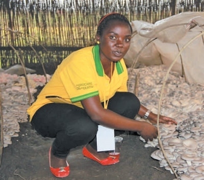 盧旺達(dá)國立大學(xué)的學(xué)生姍臺(tái)在菇棚中采收平菇。 中國國家菌草工程技術(shù)研究中心供圖