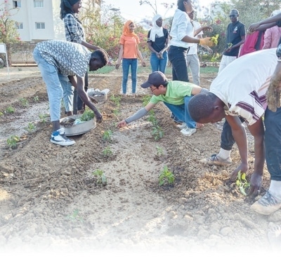 達(dá)喀爾大學(xué)校園里,塞內(nèi)加爾學(xué)生跟著中國(guó)老師學(xué)習(xí)移栽辣椒苗。中國(guó)援塞內(nèi)加爾農(nóng)技專(zhuān)家組供圖