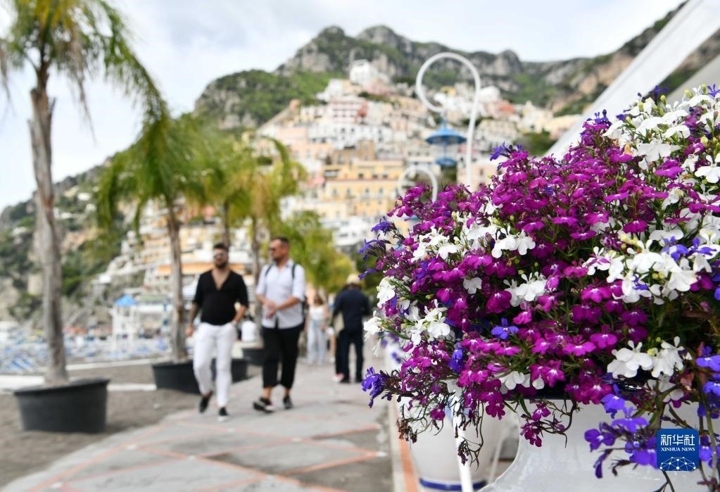 這是5月3日在意大利阿馬爾菲海岸小鎮(zhèn)波西塔諾拍攝的街邊擺放的鮮花。