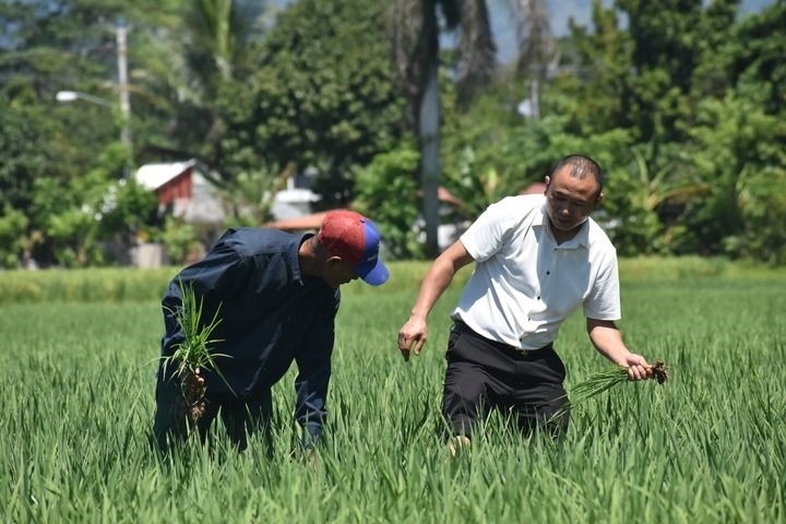 4月26日,在多米尼加首都圣多明各西北約80公里處,中國農(nóng)業(yè)專家(右)和當(dāng)?shù)剞r(nóng)民在多米尼加國家水稻培訓(xùn)中心的一片試驗田內(nèi)工作。新華社記者 朱婉君 攝