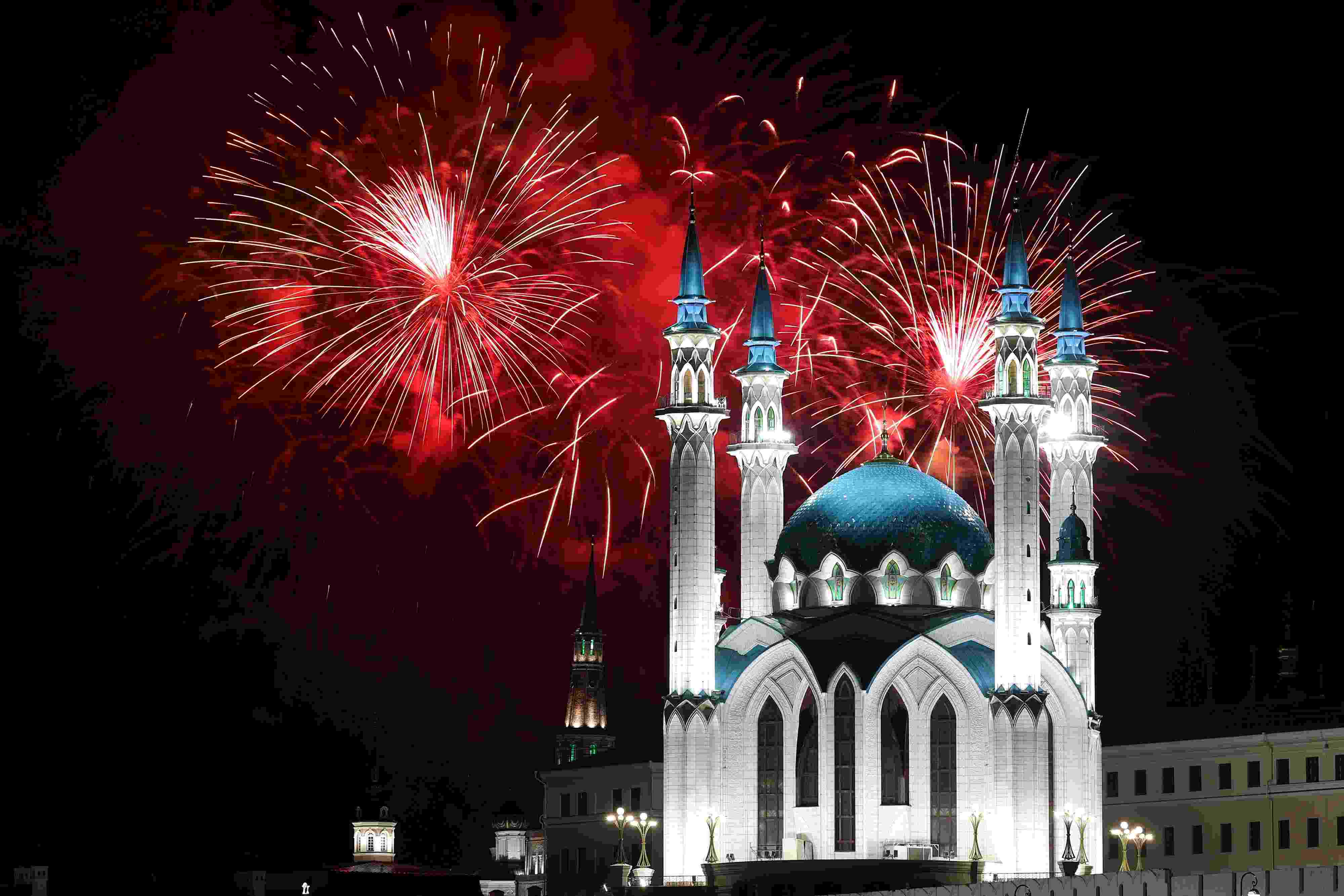 當(dāng)?shù)貢r(shí)間2023年5月9日,俄羅斯喀山,紀(jì)念衛(wèi)國(guó)戰(zhàn)爭(zhēng)勝利78周年,庫爾沙里夫清真寺燃放煙花。視覺中國(guó)