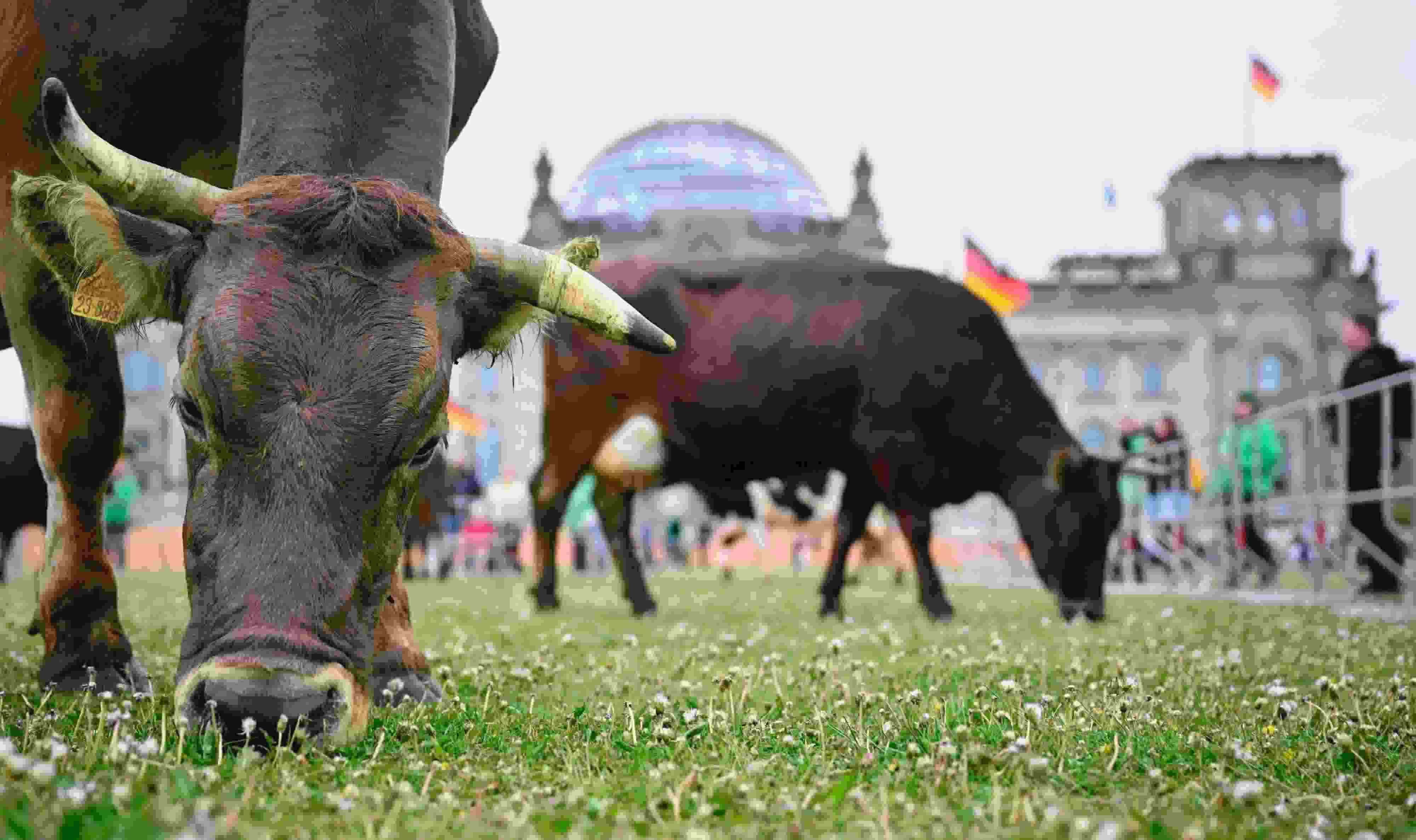 當(dāng)?shù)貢r(shí)間2023年5月16日,德國(guó)柏林,牛群被驅(qū)趕到國(guó)會(huì)大廈前吃草?;顒?dòng)組織者希望通過(guò)這一行動(dòng),呼吁政治家們采取更多措施來(lái)促進(jìn)牧場(chǎng)農(nóng)業(yè)。 視覺(jué)中國(guó)