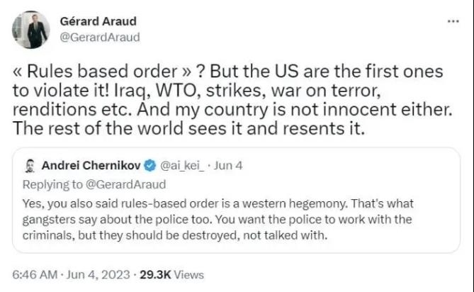 在另一條推文中,阿羅指出,從美國在伊拉克戰(zhàn)爭、世貿(mào)組織違規(guī)、所謂“反恐戰(zhàn)爭”中的表現(xiàn)可見,是美國首先違反了“基于規(guī)則的秩序”。世界上其他國家看到了這一點,對此感到憤慨。