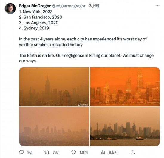 6月7日,紐約市深陷加拿大山火導(dǎo)致的煙霾之時(shí),有網(wǎng)友在社交媒體上列出2019年悉尼、2020年洛杉磯和舊金山、2023年紐約的類似污染畫面,并留言道:“地球在著火”“我們必須作出改變”。