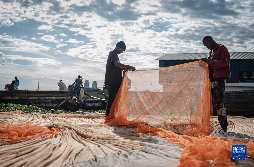 6月10日,坦桑尼亞姆萬扎省維多利亞湖畔的漁民整理漁網(wǎng)。