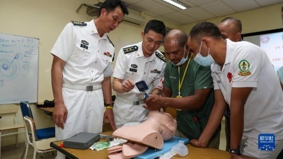 中國(guó)海軍“和平方舟”號(hào)醫(yī)院船派出醫(yī)療專家分隊(duì)赴東帝汶國(guó)立醫(yī)院進(jìn)行ACLS培訓(xùn),醫(yī)院船醫(yī)療專家為當(dāng)?shù)蒯t(yī)護(hù)人員進(jìn)行實(shí)操講解(9月5日攝)。新華社記者 黎云 攝