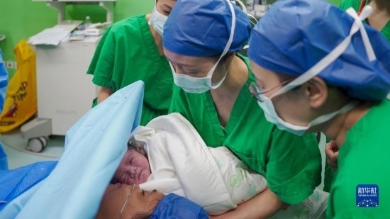 中國(guó)海軍“和平方舟”號(hào)醫(yī)院船執(zhí)行“和諧使命-2023”任務(wù)中的第3名“和平寶寶”在東帝汶誕生,新生兒與母親第一次見面(9月5日攝)。新華社發(fā)(李珂嘉賀 攝)