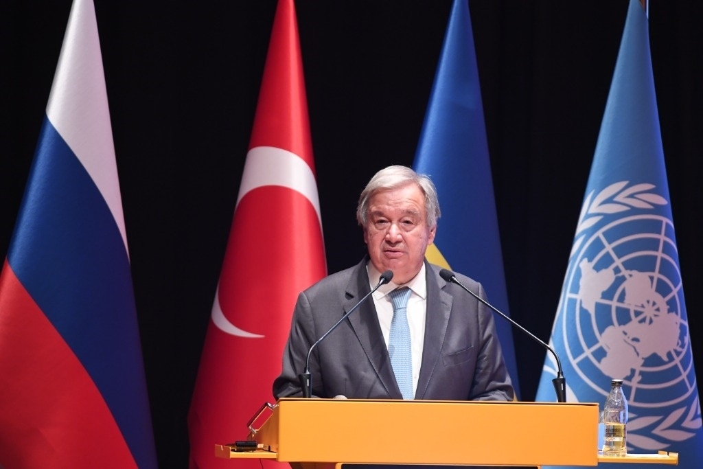 2022年8月20日,在位于土耳其伊斯坦布爾的土耳其國防大學(xué)內(nèi)的黑海糧食外運聯(lián)合協(xié)調(diào)中心,聯(lián)合國秘書長古特雷斯出席新聞發(fā)布會。新華社記者沙達提攝