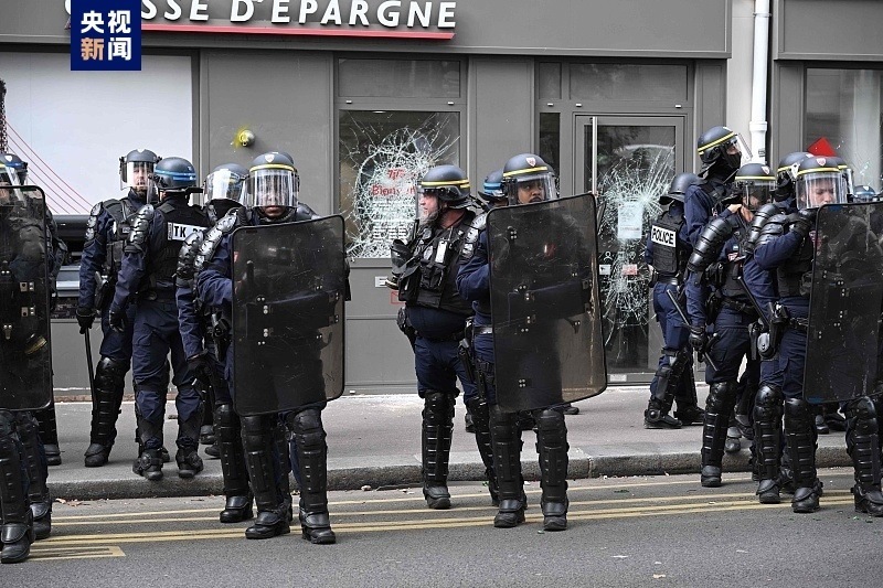 在法國首都巴黎,游行隊(duì)伍下午3點(diǎn)左右從北站平靜出發(fā)后,隨后一個由數(shù)百名蒙面男子組成的隊(duì)伍破壞了銀行機(jī)構(gòu)的櫥窗,并向一輛警車投擲石塊。巴黎警察局稱,這輛汽車遭到“鐵棍”的打擊。車上一名警察手持武器下車,以便與示威者保持距離。一支摩托車警察部隊(duì)隨后趕來,阻止了破壞行為并保護(hù)了車上的警察。