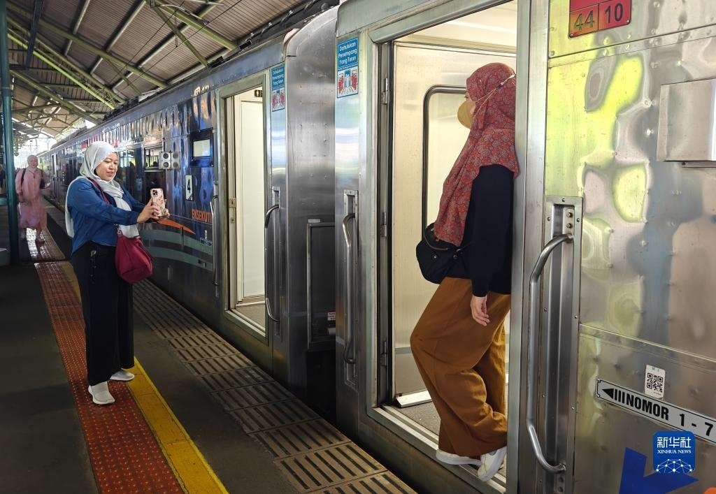 8月27日,乘客在印度尼西亞雅加達甘比爾車站的站臺上拍照(手機拍攝)。新華社記者 徐欽 攝