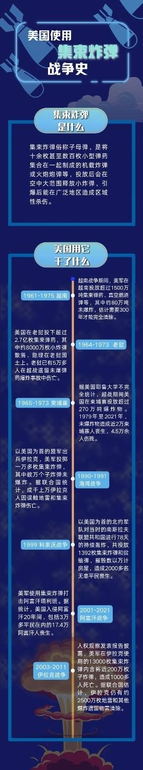 集束彈藥比普通彈藥殺傷力更強、造成平民傷亡可能性更大。美國空軍曾經在越南戰(zhàn)爭、海灣戰(zhàn)爭、伊拉克戰(zhàn)爭等戰(zhàn)事中大量使用集束炸彈,給這些國家民眾及子孫后代帶來無法磨滅的傷痛。