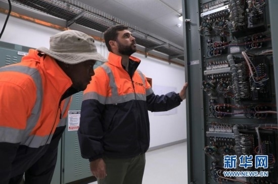 8月10日,在南非北開普省德阿鎮(zhèn),當(dāng)?shù)鼐用?、變電站工作人員達(dá)斯溫·巴松(左)與變電站副主管雷加特·范滕德在龍?jiān)茨戏枪镜掳L(fēng)電項(xiàng)目變電站工作。新華社記者 董江輝 攝