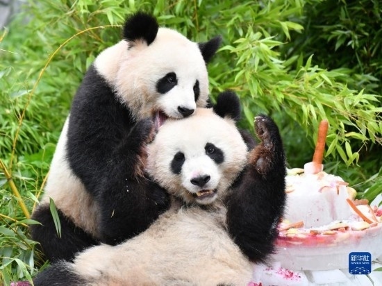 8月31日,大熊貓“夢想”(左)和“夢圓”在德國柏林動物園享用“生日餐”。當日,在德國出生的大熊貓雙胞胎兄弟“夢想”和“夢圓”迎來4歲生日,柏林動物園為它們舉辦了慶祝活動。新華社記者 任鵬飛 攝
