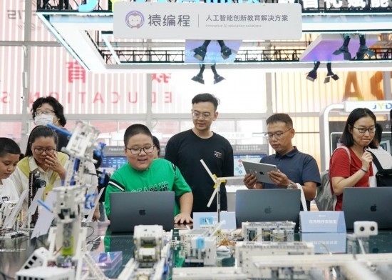 9月3日,在首鋼園教育服務(wù)專題展區(qū),小朋友在體驗智能硬件編程作品。新華社記者 張晨霖 攝