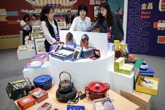 9月6日,與會(huì)嘉賓在第六屆絲綢之路(敦煌)國(guó)際文化博覽會(huì)上參觀(guān)文創(chuàng)產(chǎn)品和文旅裝備展銷(xiāo)活動(dòng)。新華社記者 馬希平 攝
