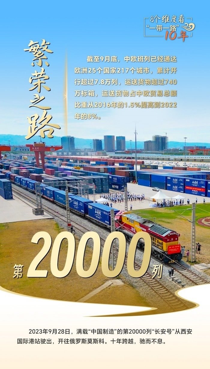 第20000列“長安號”從西安國際港站駛出,給世界送去“中國制造”;中老鐵路突破重山阻隔,成為國際物流的“黃金通道”;蒙內(nèi)鐵路聯(lián)通東西,是東非鐵路網(wǎng)的開端,更是一條充滿希望的經(jīng)濟(jì)走廊……一個(gè)個(gè)合作豐碑,搭建起高效的貿(mào)易通道網(wǎng)絡(luò)平臺(tái),助力各國走好走穩(wěn)“一帶一路”這條繁榮之路。